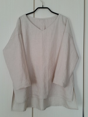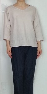 これは着やすそうだな〜と型紙が届いてすぐに作りました。タックまでは問題なくサクサクといったのですが、見返しでひっかかりました。選んだ生地がよりの甘いガーゼだったなのが主敗因で、この極細の見返しには向かなかったのでしょうね。切り込みをいれるところまでは頑張りましたが、どうしてもうまくできそうになかったので、手持ちのバイアステープ処理に切替えて作りました。(ごめんなさい!)生地にもよるのでしょうが、ガーゼで作るときは見返しだけ別布にするとか、端に洗濯のりをスプレーしてほつれにくくするとか工夫した方がいいのかな。同じく、ポケットの3mm→6mmもうまく縫えそうになかったので5mm→7mmくらいにして縫いました。