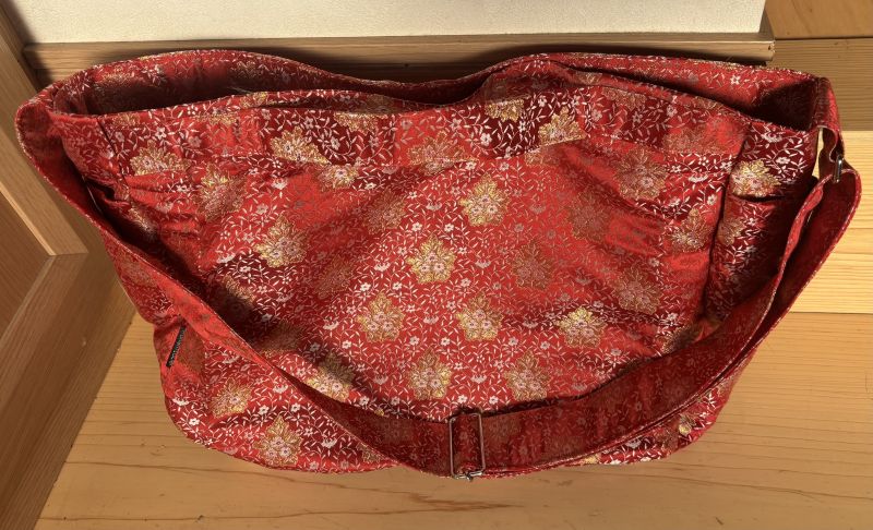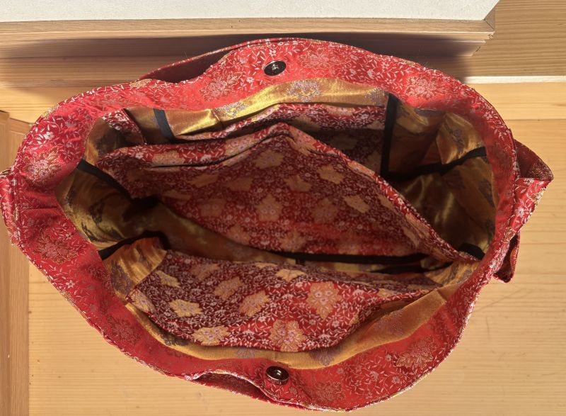 大きいからといって中身をパンパンに入れるのではなく、くたっと持つのがこのバッグの特徴です。お気に入りの布地で作れば主役級のバッグに。