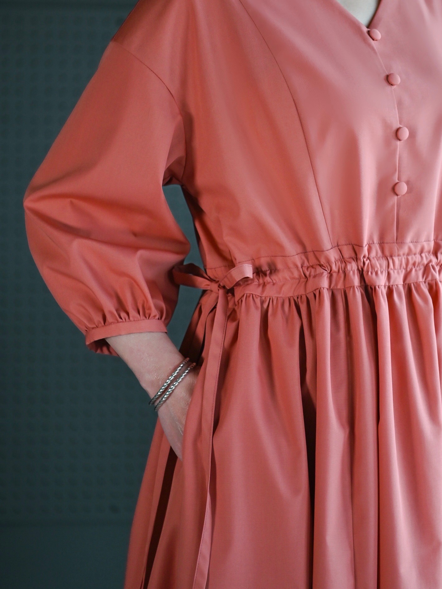細かいギャザーと裾広がりのラインなど、綿密に計算されたデザインです。