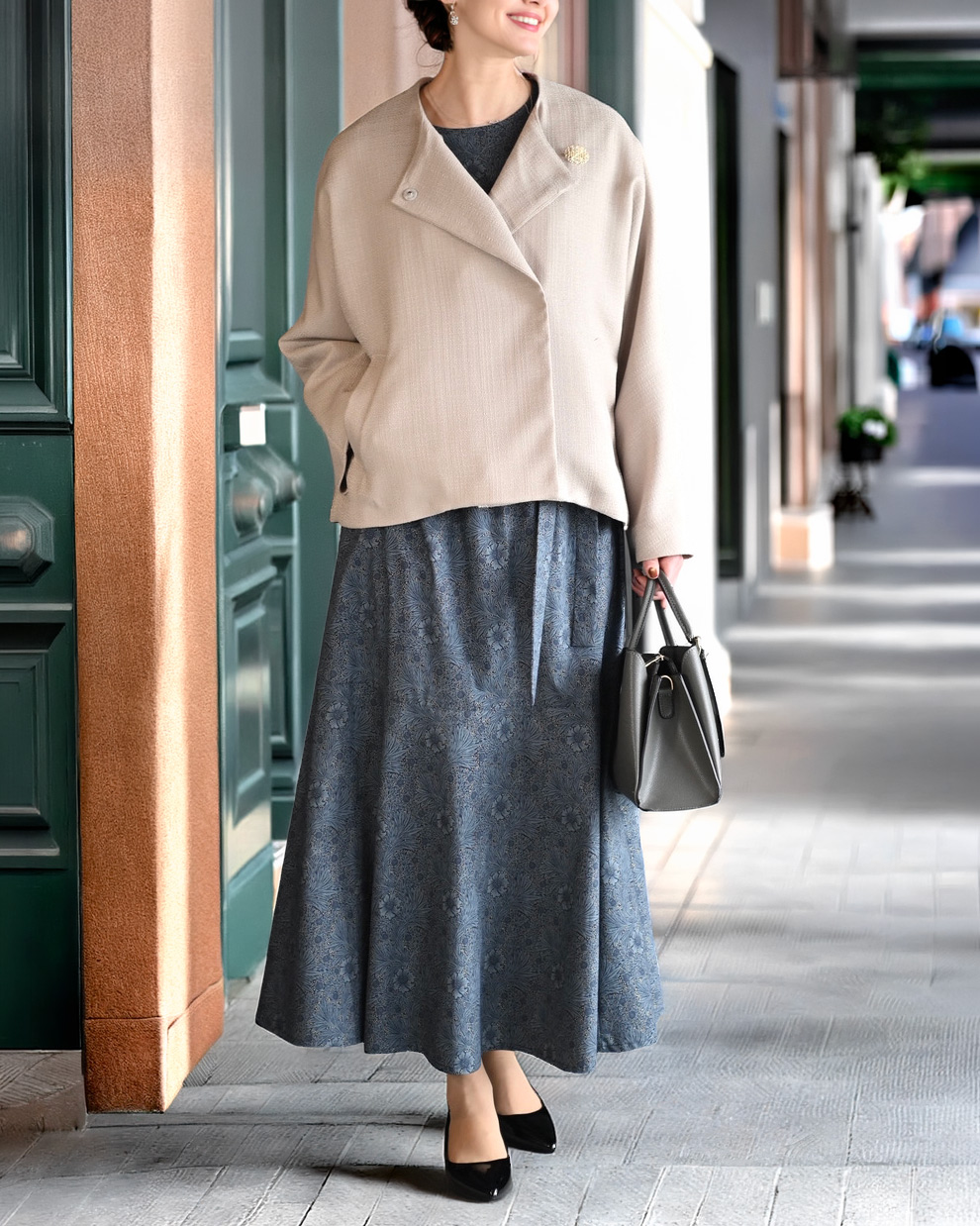 | 8)柔らかいウール ざっくりと織られた表情のある布地は、ほつれやすく縫いにくい面もありますが、軽くて着やすいコートに仕上がります。作業がしにくい場合は薄手の接着芯を裏側全面に貼ると伸びやほつれも防げて作業がしやすいです。 ■ワンピース:テントドレス布地キット03 ■ 布地:クロス模様のウール ■モデル:身長159cm S-Mサイズ着用 | 9)上品な装いに ウール素材のコートは、ダウンやブルゾンと違い高級感を演出できます。ワンピースと合わせて寒い時期のお出かけに。 ショート丈のコートはパンツでもスカートでもバランスよく着ていただけます。 ■ワンピース:テントドレス布地キット03 ■モデル:身長159cm S-Mサイズ着用 |