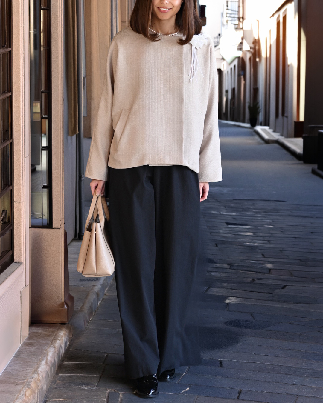 身頃から続く「ドルマンスリーブ」のお袖は、肩まわりを華奢に見せ、どんな体型の方にも似合うデザインです。