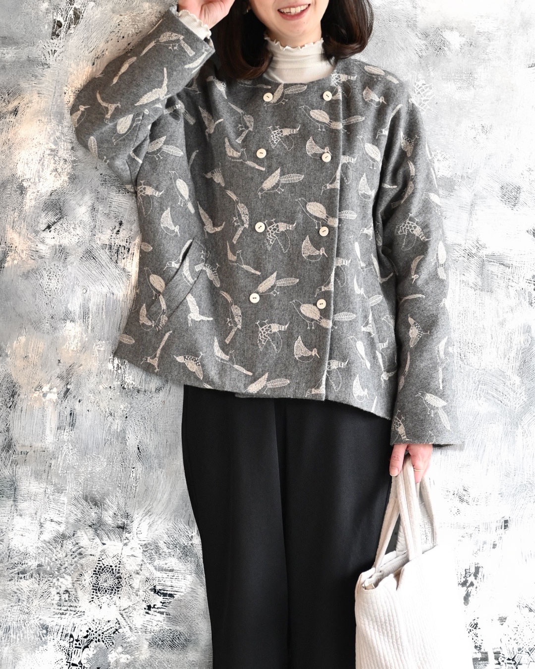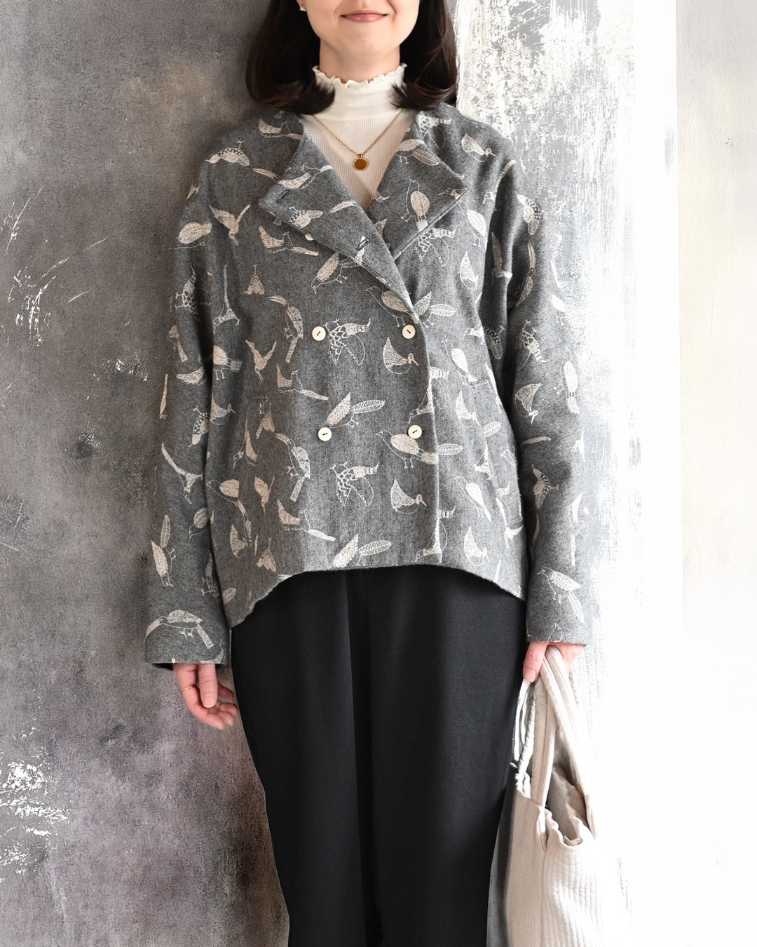 | SA03) 気軽に羽織れる薄手のコート 小さなボタンをアクセントにした、薄手のウールコート。 裏付きの仕様なので脱ぎ着もスムーズです。 ■使用布地:ウールに刺しゅうBIRD | SA04)ボタンを開けて抜け感を 第一ボタンをあけて着ると首元にVラインの抜け感が生まれます。お顔周りがスッキリと明るい印象に。 ■モデル身長:155cm S-Mサイズ着用 |