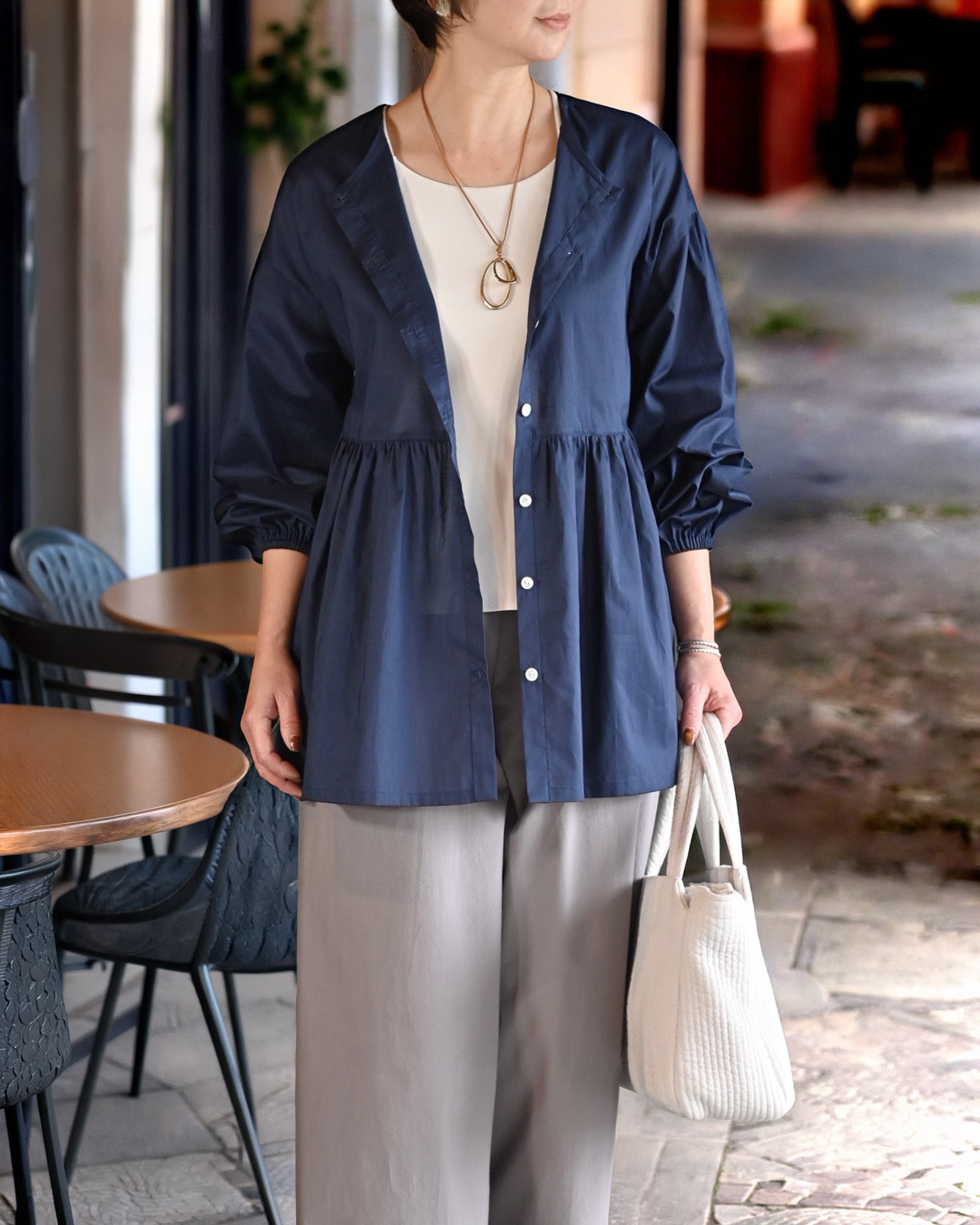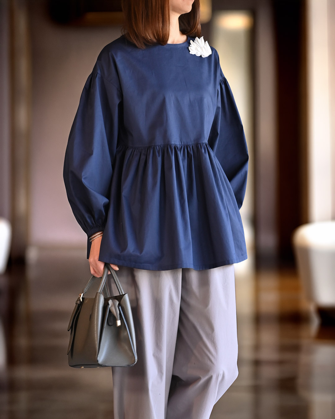 無地だからこそ際立つ布地の上質感が、より感じられるブラウスに仕上がります。