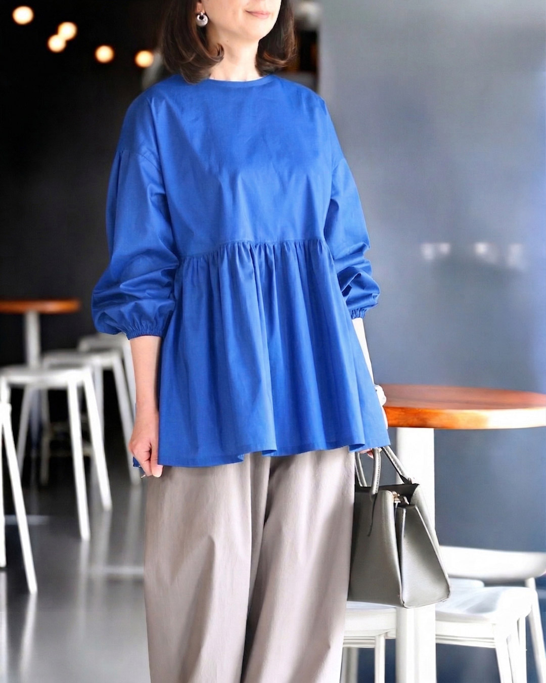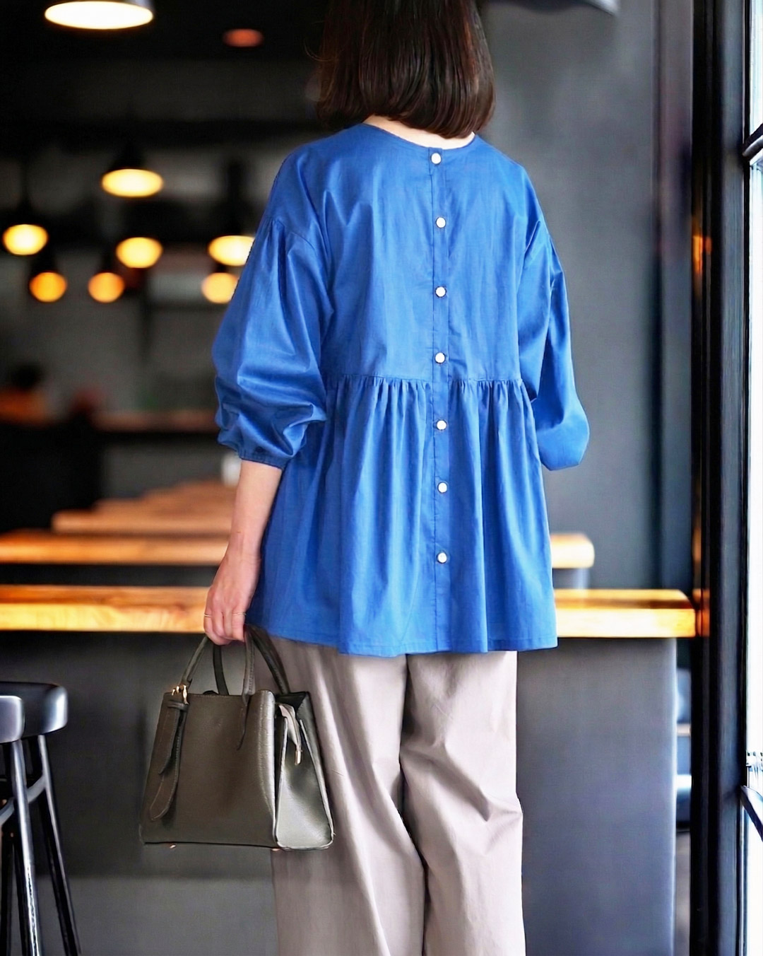 | 16)2WAY仕様のブラウス 前後どちらを前にしても着用できる「2WAY仕様」のブラウスの布地キットです。ふんわりとしたボリュームスリーブにギャザー切替を入れた華やかなデザインが特徴です。 ■モデル:身長155cm 長袖着用 ■ ボトム:ペチパンツ | 17)小さなボタンのアクセント 縦に小さく並べたボタンがアクセントになり、縦長のラインを強調して着やせ効果も期待できます。型紙について、詳しくはこちらをご覧ください。 ■着用カラー:エレクトリックブルー |