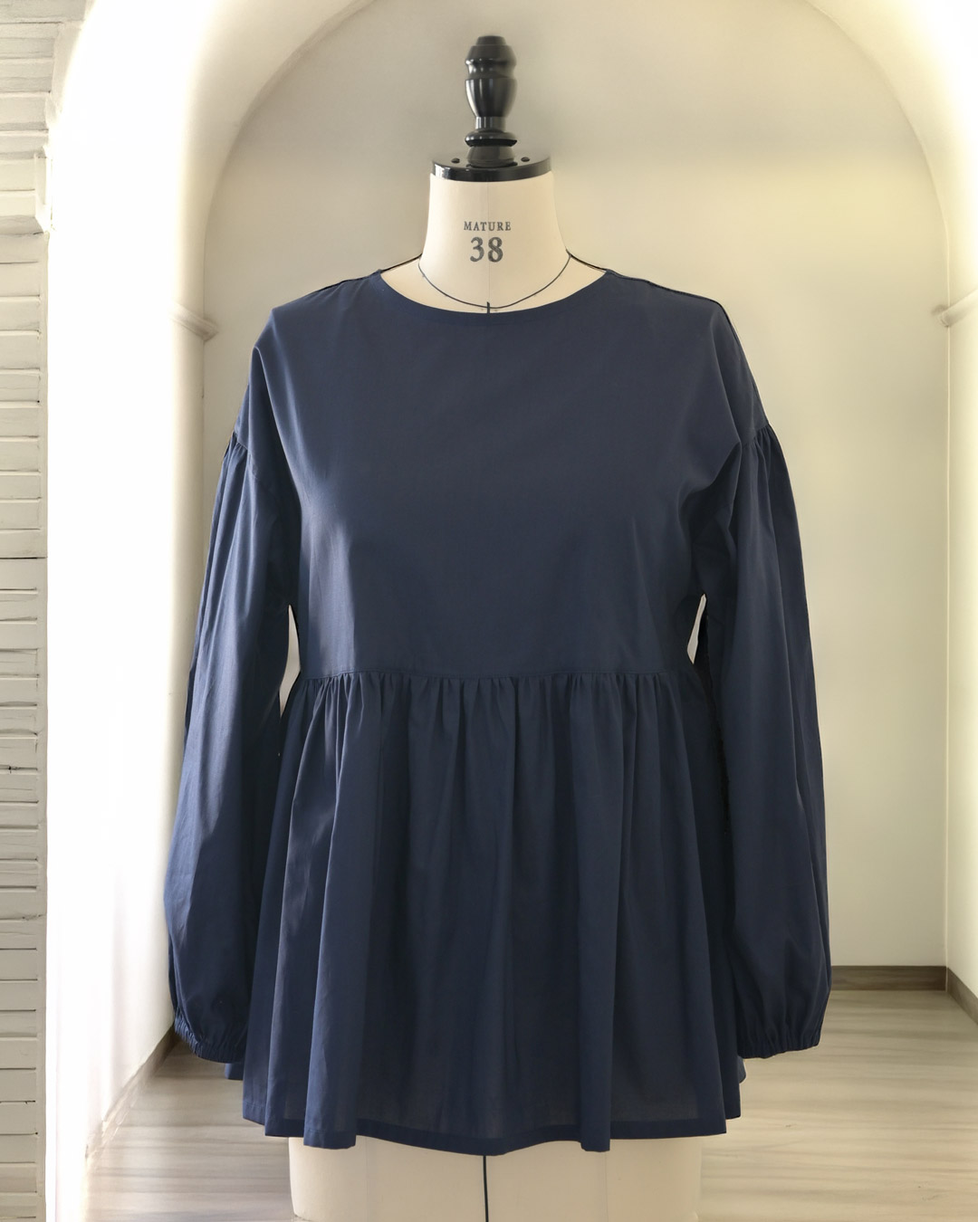 | 13)ネイビーレイク制作例 透け感の参考にベージュのインナーを着用しています | 14)ネイビーレイク 学校行事やオフィスにも。凛とした気品漂う濃紺。 ※推奨ミシン糸/シャッペスパン色番99 (目安の色番で布地の色と全く同じではありません) |